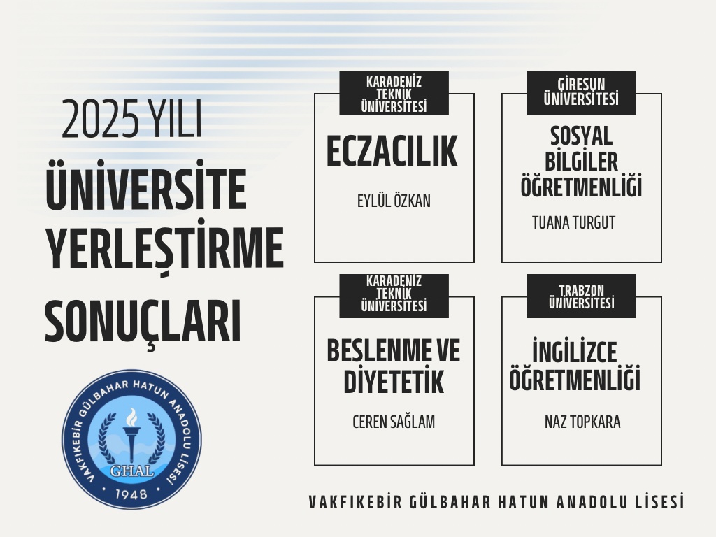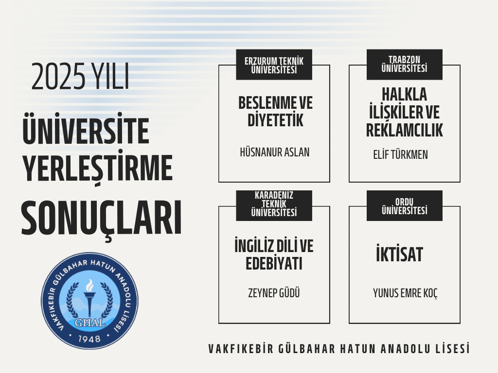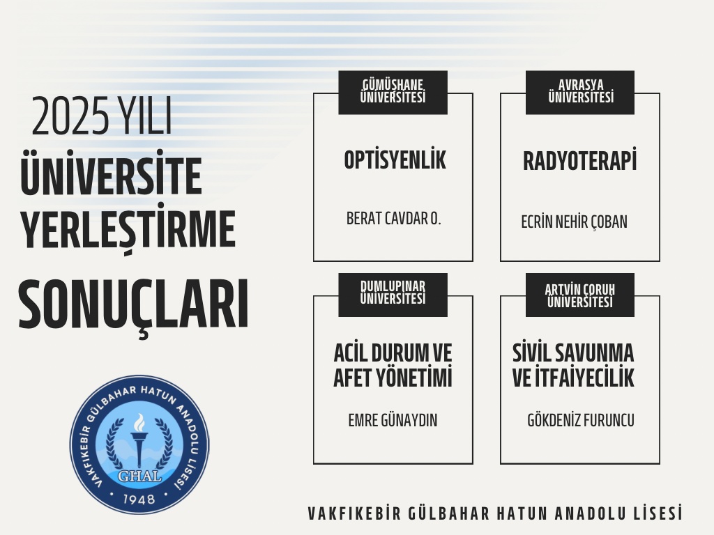 2025 YKS yerleştirme sonuçlarına göre öğrencilerimiz ülkemizin çeşitli üniversitelerine yerleşti.Onların azmi ve emeğiyle kazandıkları bu başarıda katkısı olan tüm öğretmenlerimize ve destek veren velilerimize teşekkür ediyoruz.Sevgili öğrencilerimize de yeni yolculuklarında sonsuz başarılar diliyoruz.